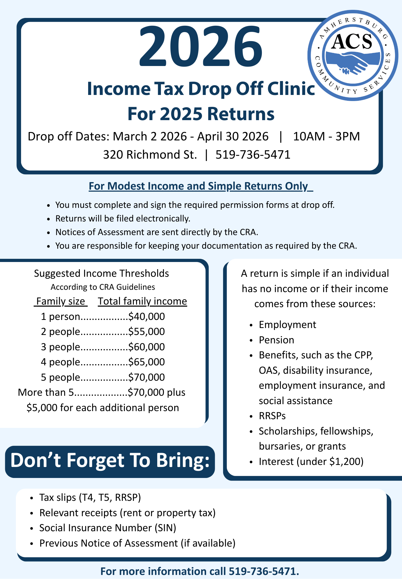 Our friendly volunteers can help you file your personal taxes on time. Tax Clinics at our office usually begin in March every year. You must meet certain eligibility criteria and must make an appointment in advance to drop off your paperwork. Click the button below to provide your contact information and one of our friendly staff or volunteers will be in touch to provide more information.